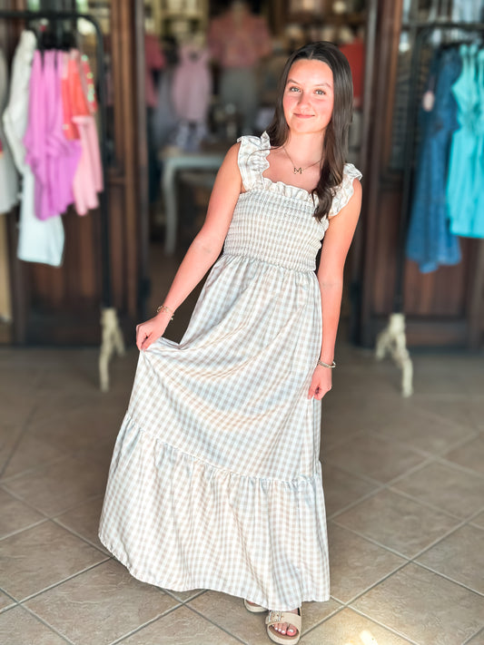 Girls Light Blue Windowpane Stripe Puff Sleeve Smocked Dress