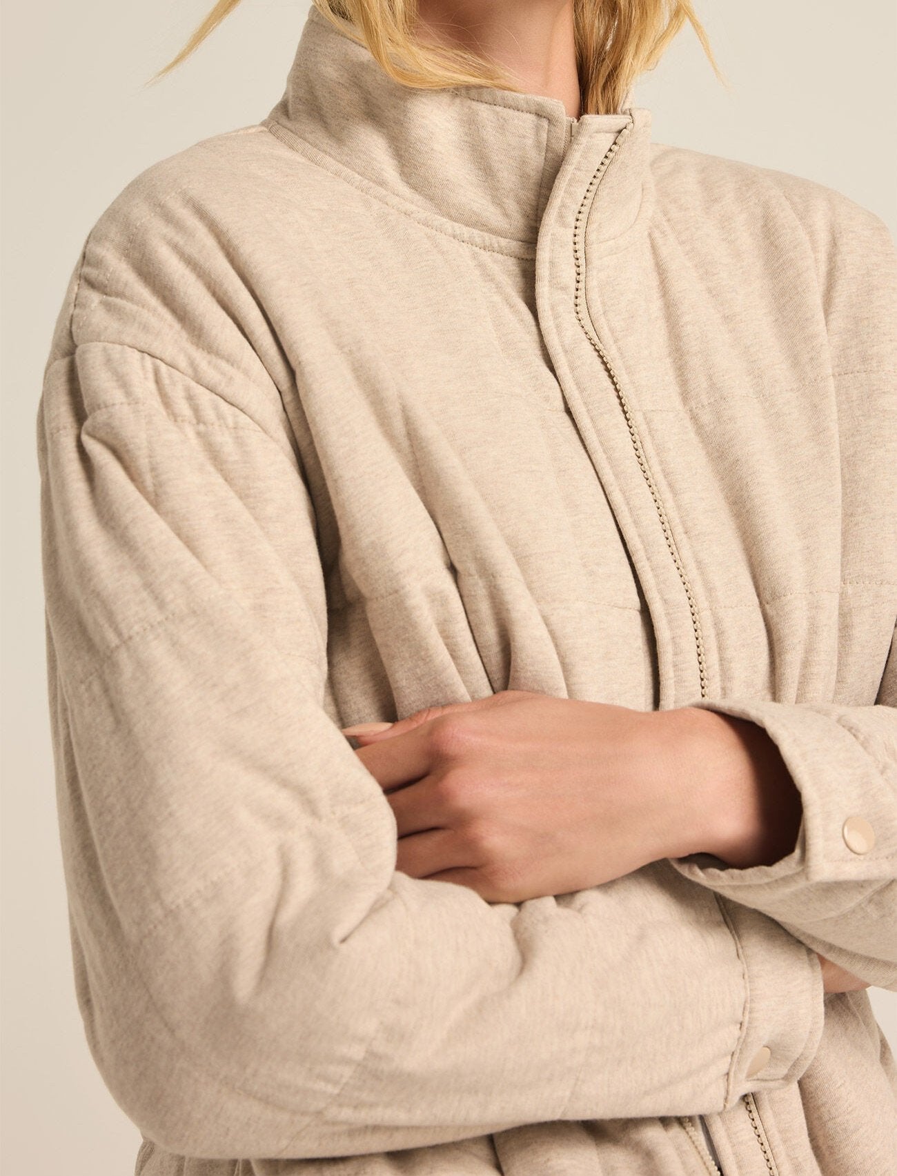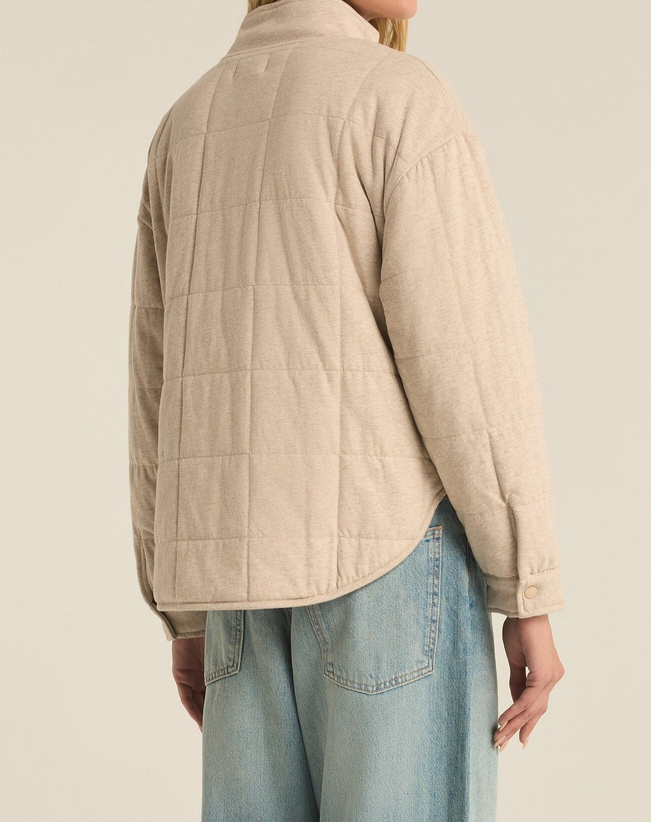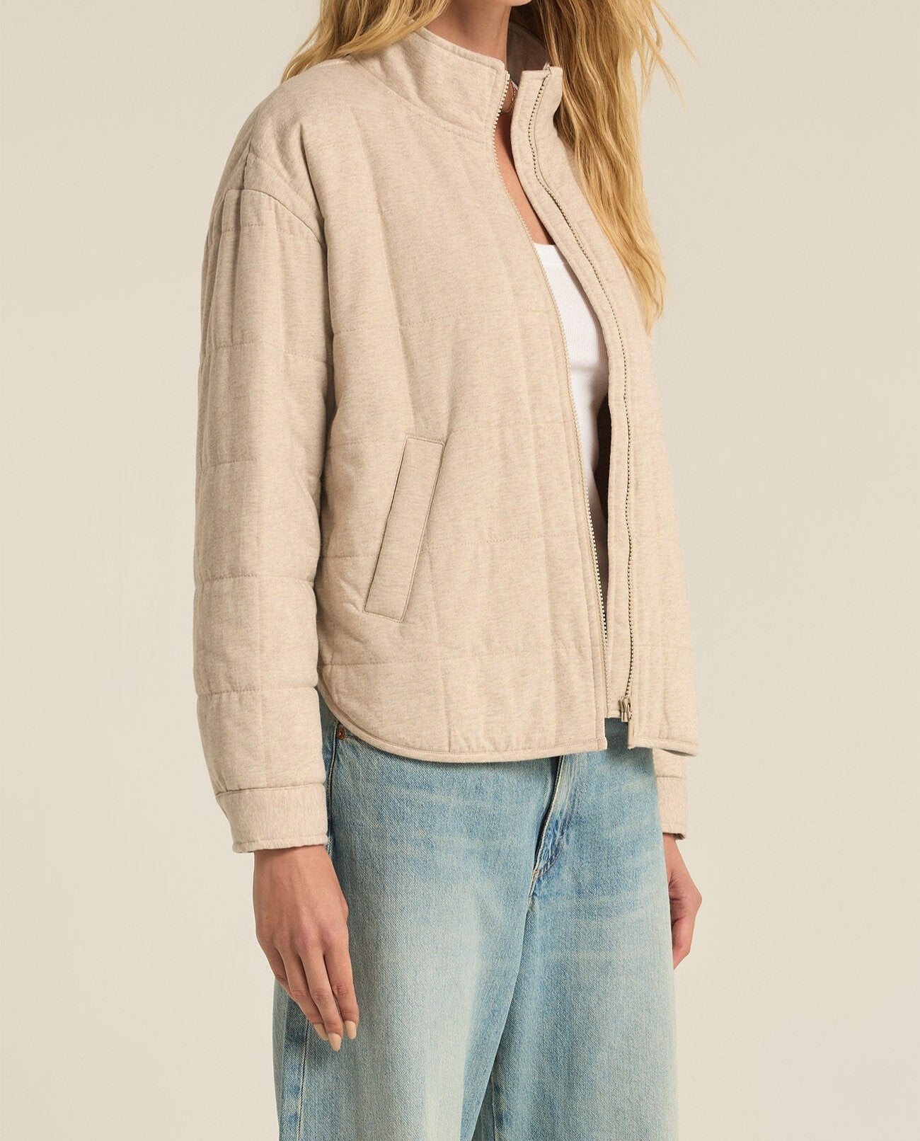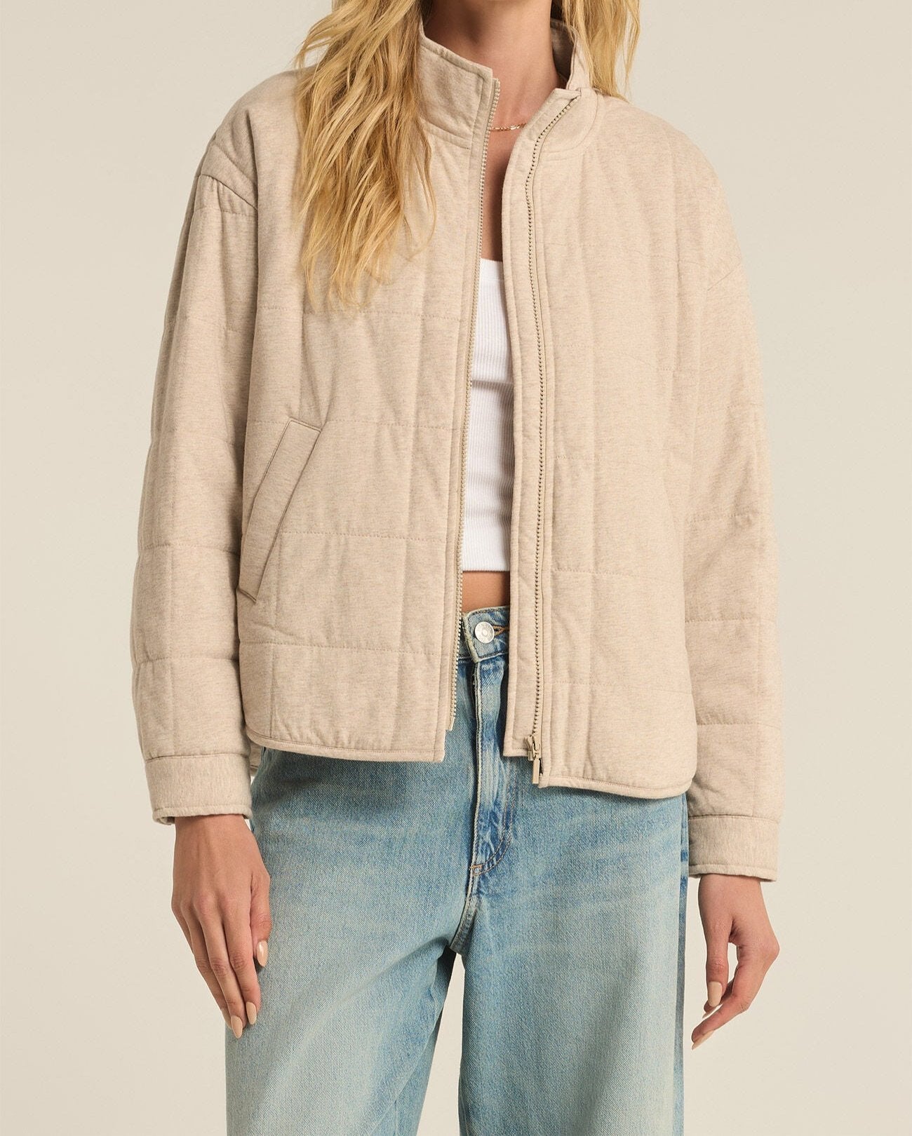 Get cozy with the Bonfire Jacket! This stylish quilted jacket features a zip front, welt pockets, and a curved hem for a flattering fit. Made with a soft jersey blend, this jacket is perfect for all your casual outings. Length from shoulder measures 25". Don't wait, get your hands on this regular fit jacket now!