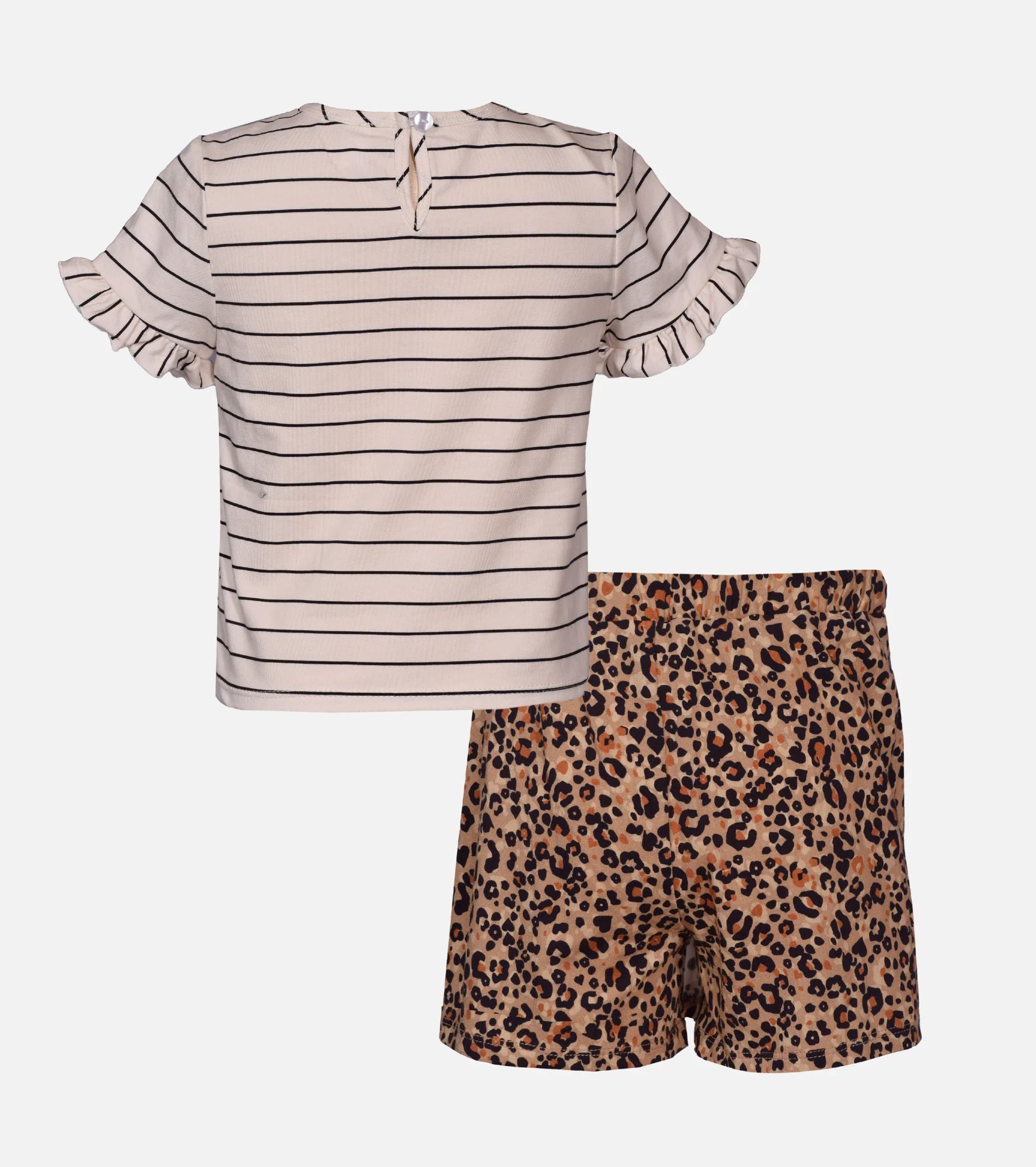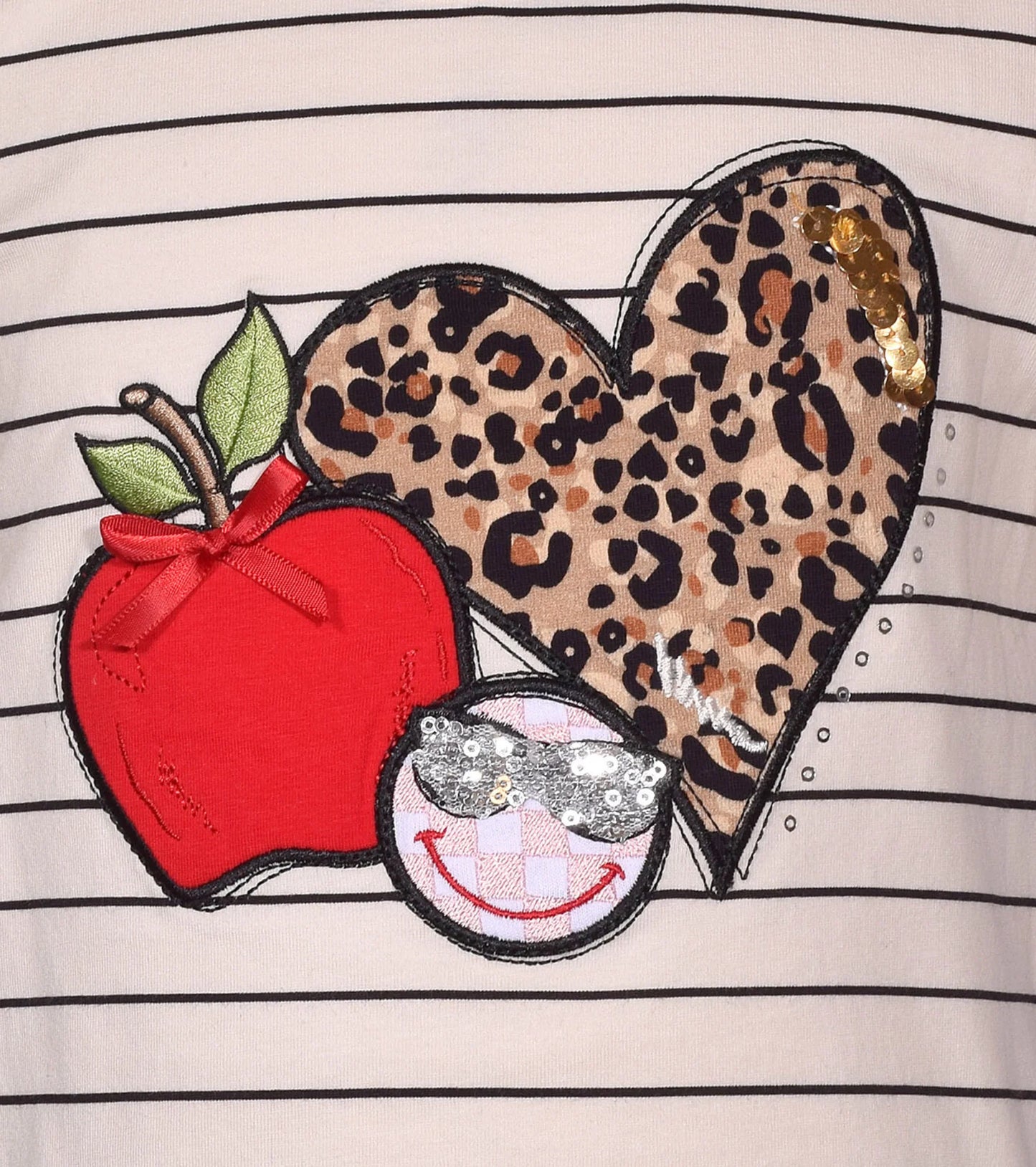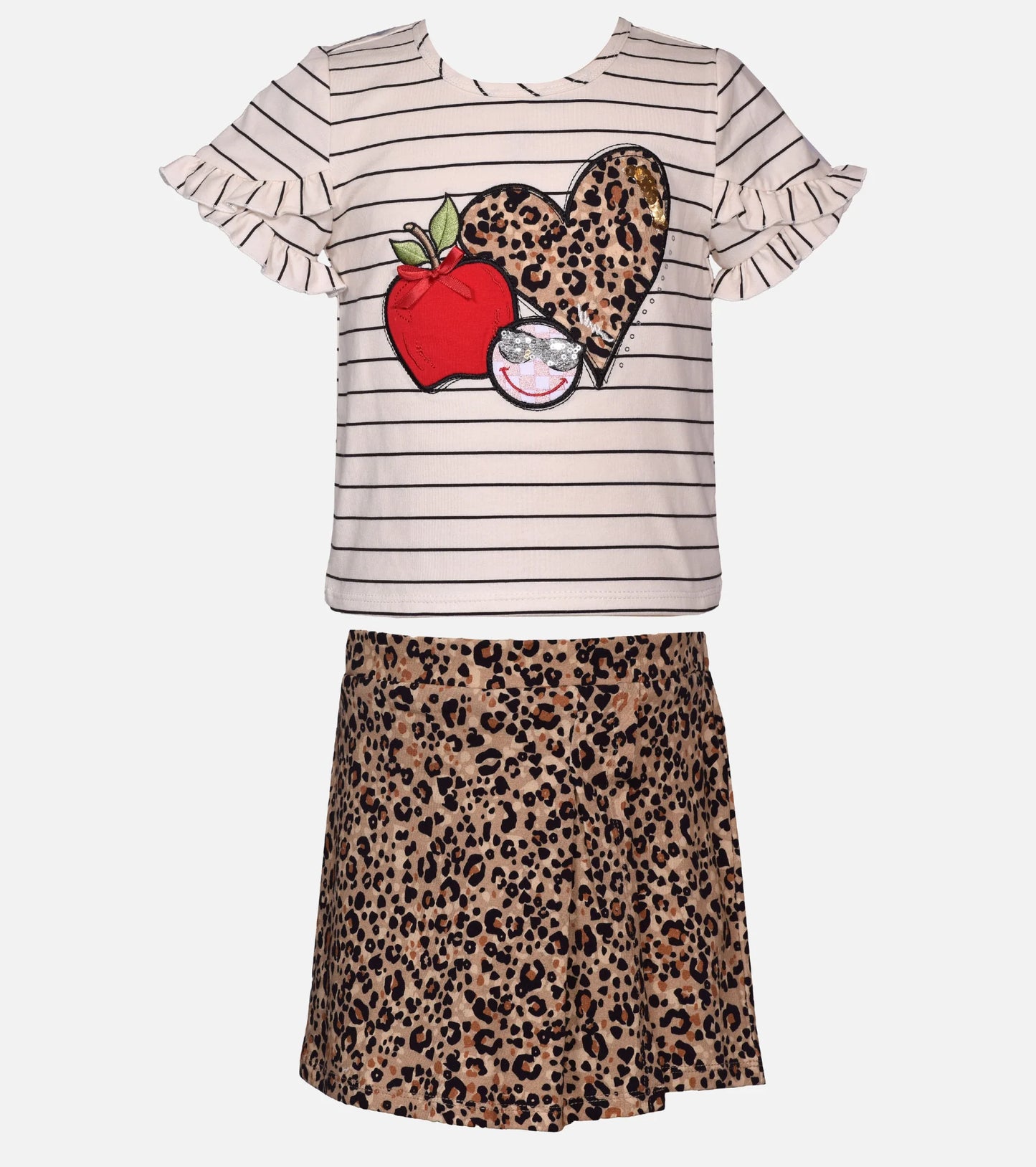 Elevate your wardrobe with the Annie Cheetah Skort Set, featuring a striped knit top adorned with charming apple, cheetah heart, and smiley face embellishments. Paired with a chic cheetah print skort detailed with stylish pleats, this set combines playful fun and trendy flair. Crafted from a comfortable cotton-spandex blend, it offers ease of movement and effortless care with machine wash cold and line dry instructions. Perfect for making a bold, fashionable statement wherever you go.