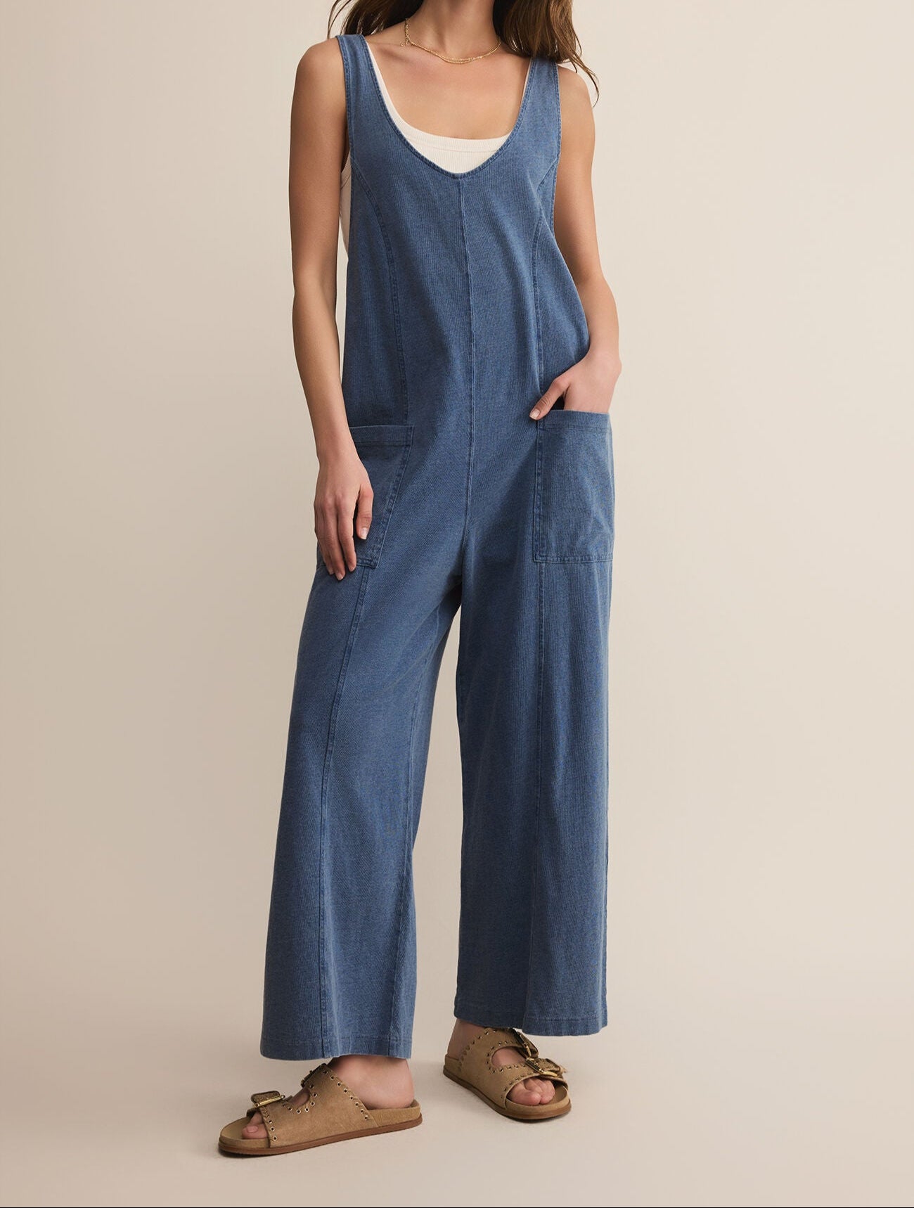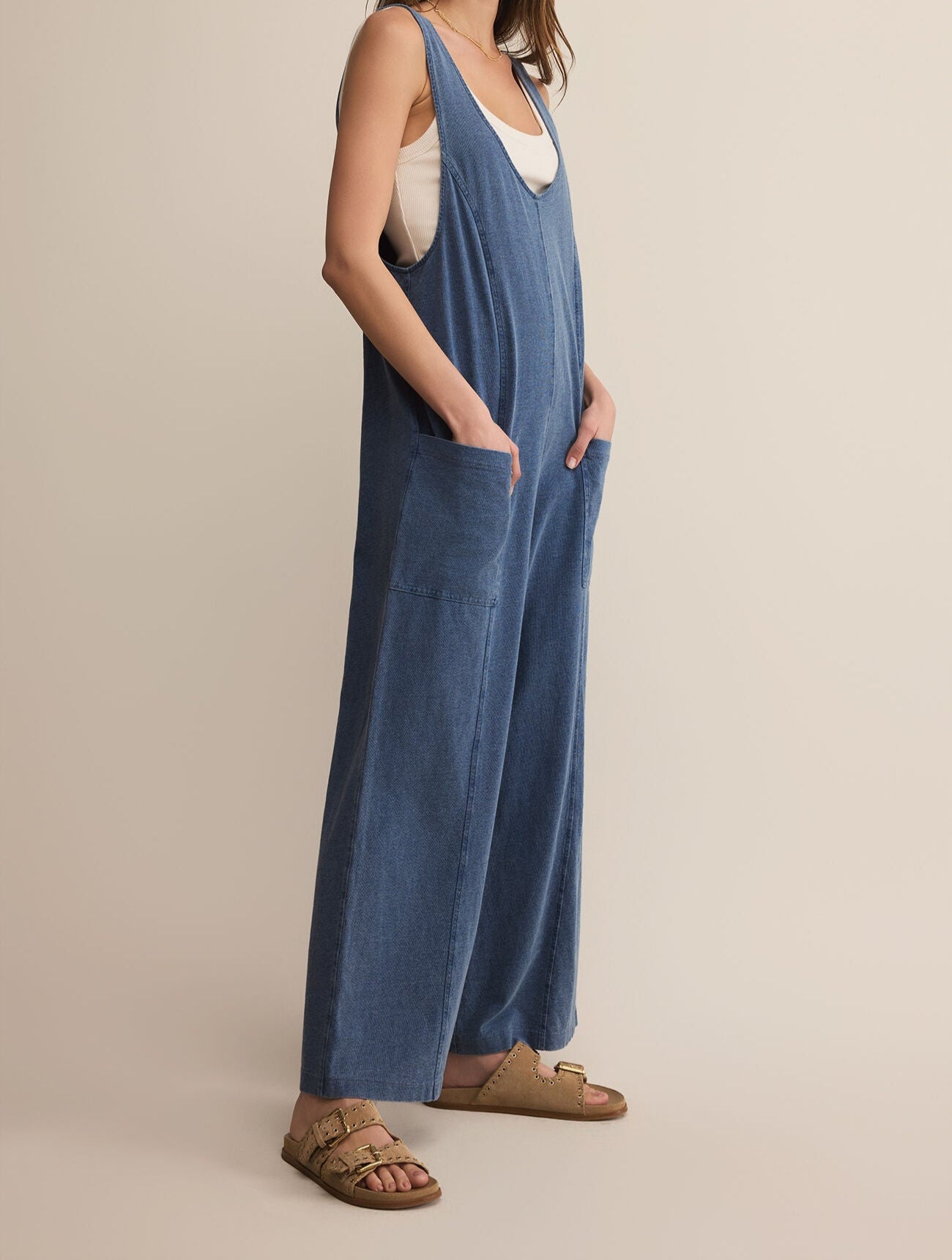 This Everyday Jersey Denim Jumpsuit combines comfort and style effortlessly. Crafted from 100% cotton jersey with a soft mineral wash, it feels lightweight and breathable for all-day wear. The scoop neck and wide, buttoned straps add a flattering touch, while the sleeveless design keeps you cool. Practical patch pockets and a tapered ankle-length leg with a 24" inseam complete the look, making it perfect for casual outings or relaxed weekends. Embrace easy, versatile fashion with this must-have jumpsuit.