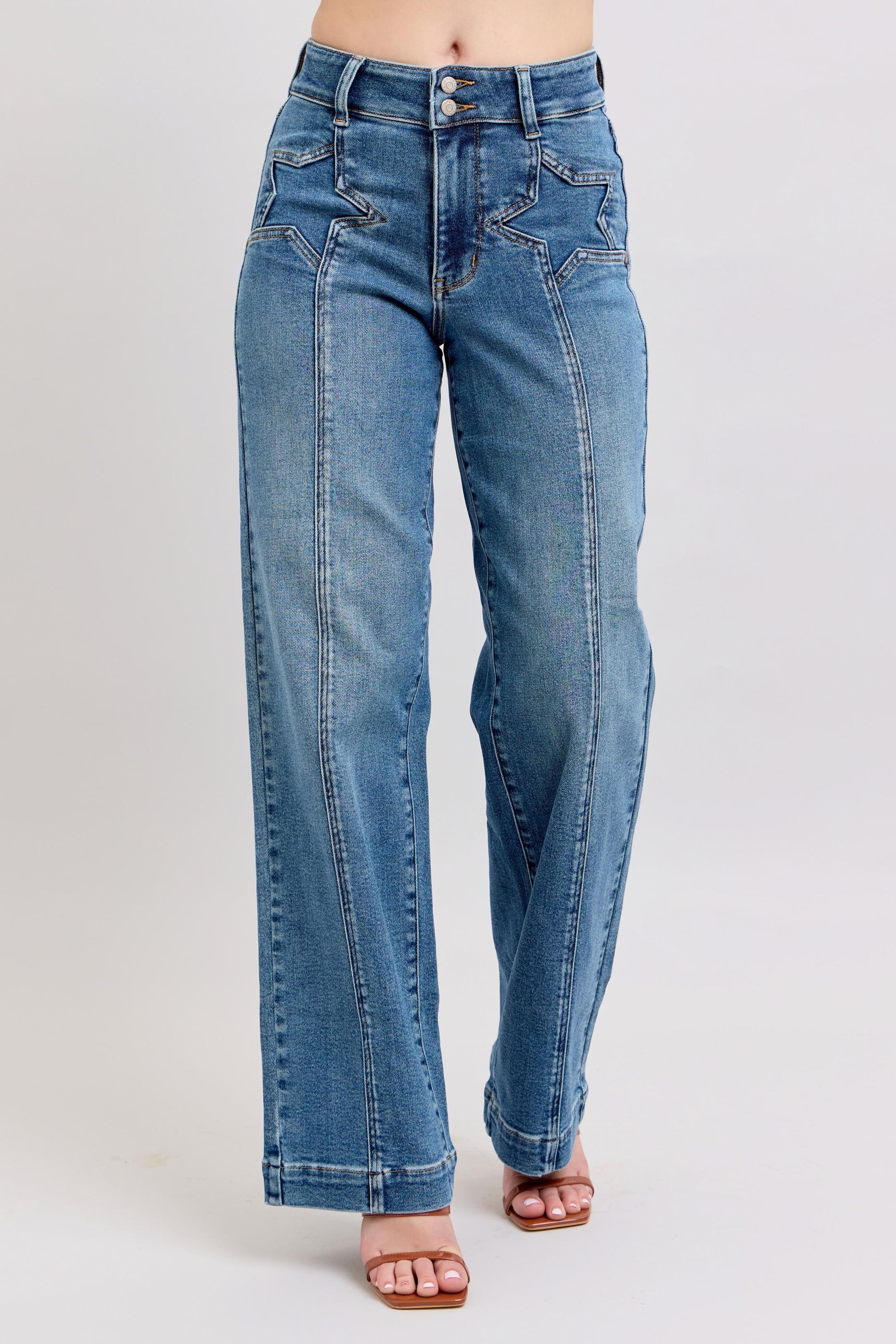 Discover the ultimate in style and comfort with Judy Blue High Rise Star From Wide Leg Jeans. These jeans offer a high rise fit, ensuring a flattering silhouette. The wide leg design provides both trendiness and comfort, making these jeans a must-have for any fashion-forward individual. Upgrade your wardrobe today!
