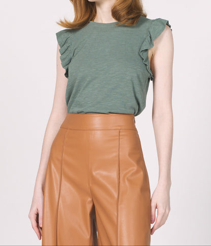 Experience effortless style with the North Tank in Slate Green. Crafted from a soft blend of 60% cotton and 40% rayon, this tank offers breathable comfort and a flattering fit. The delicate ruffle-trimmed sleeves add a feminine touch, making it perfect for layering or wearing on its own. Elevate your casual wardrobe with this versatile, stylish essential.