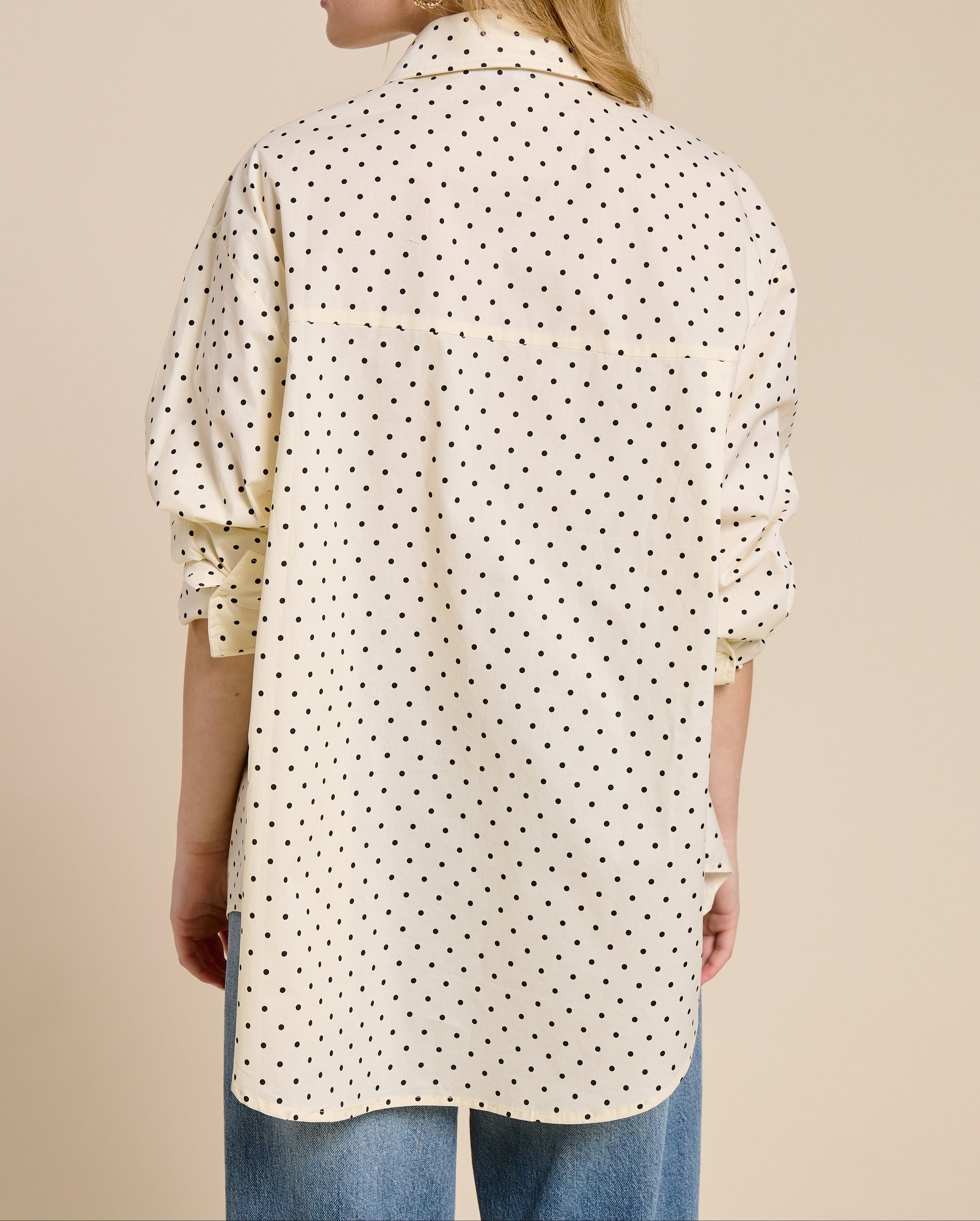 Polka dots never go out of style—and this oversized button-down proves it. Crafted from smooth woven fabric, it features a relaxed fit with drop shoulders and a curved hem that skims your frame just right. The collared neckline and full button front keep things classic, while long sleeves add versatility for any season. Throw it over a tee, pair it with your favorite denim, or dress it up with a skirt. Effortlessly chic, endlessly wearable.