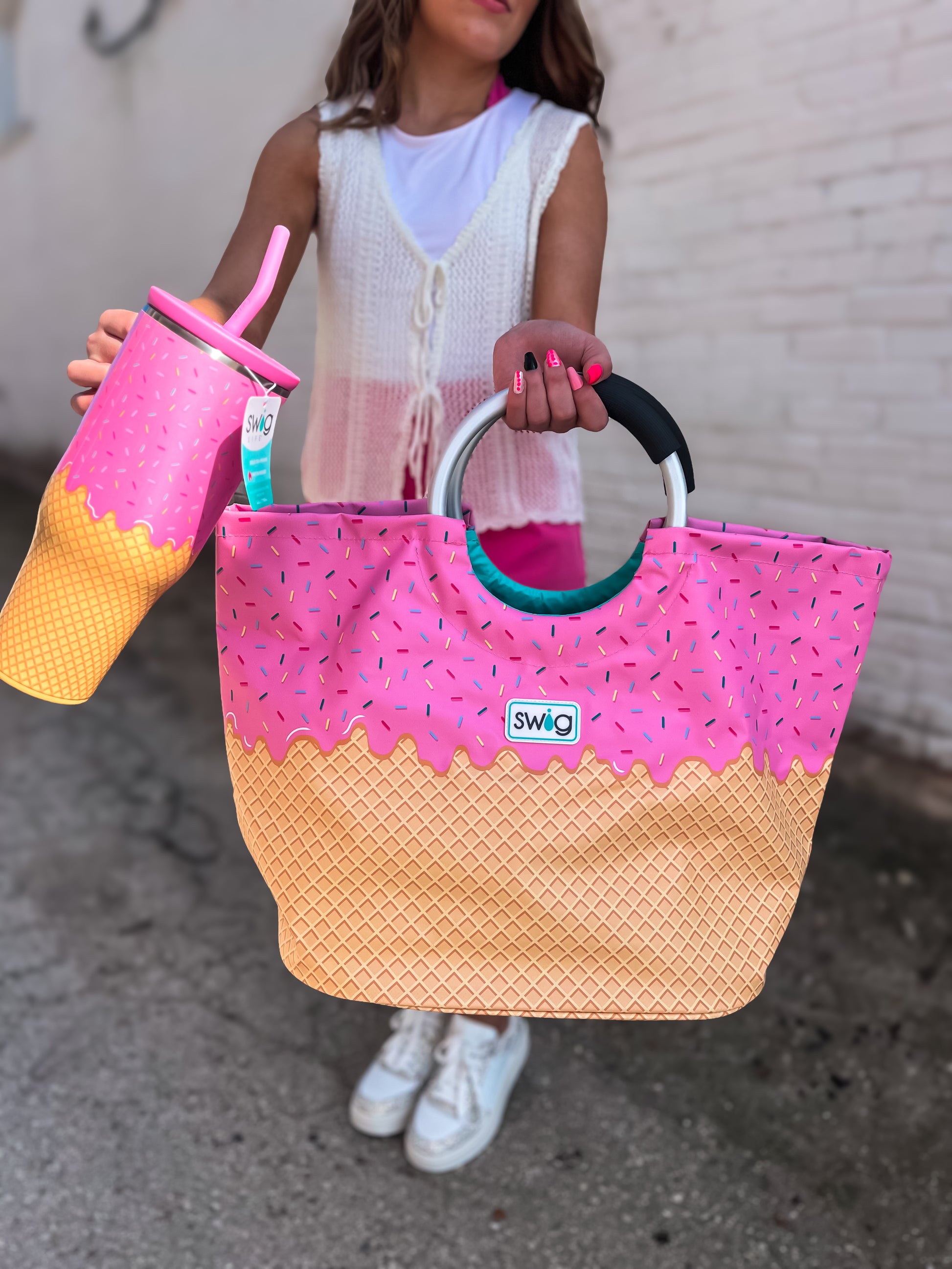 Introducing the Scoop There It Is Loopi Tote Bag! Who said totes can't be fun?🤩 This versatile bag is perfect for the pool, the market, or the store. Carry your belongings with ease thanks to the cushioned handles. Plus, it's a stylish ice cream dream with a waffle cone and scoop of pink dripping with sprinkles.🍦 Get yours now!