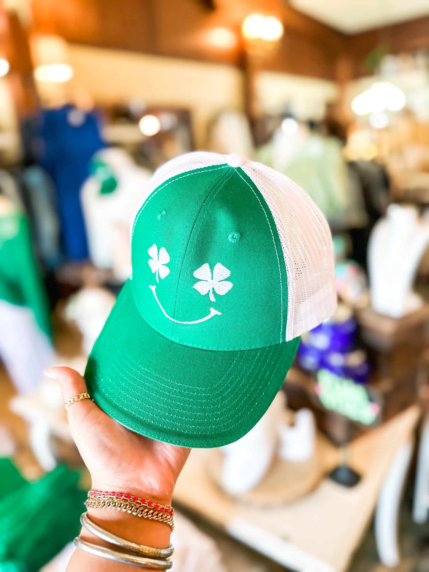 Smiley Shamrock on our Green/White Mesh Back Trucker Hat - Dad Hat 55/45 cotton/polyester twill 100% polyester mesh back