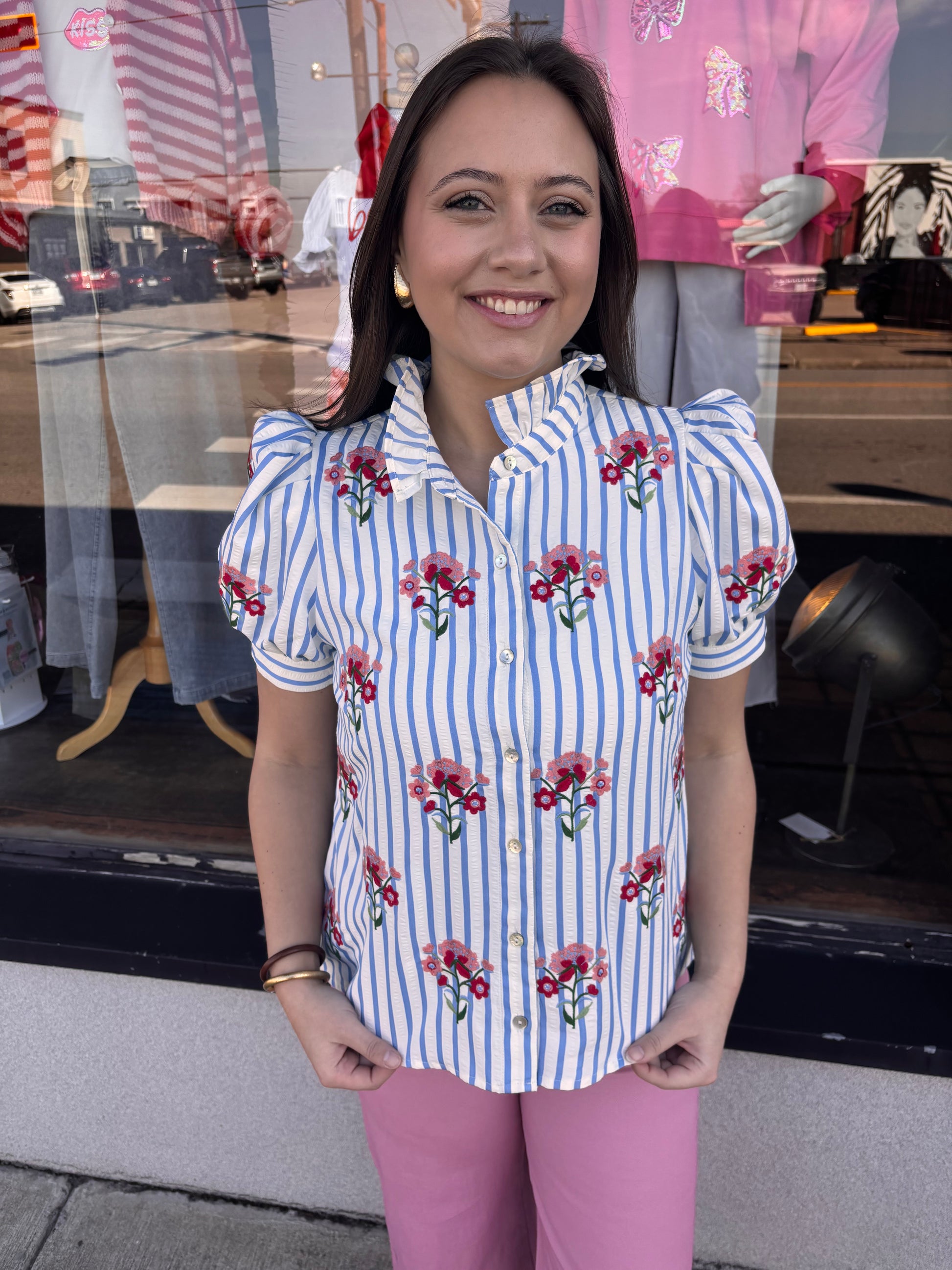 Breezy and charming, this short-sleeve top pairs crisp light blue stripes with a delicate floral print for effortless style. Perfect for warm days when you want to feel put-together without trying too hard. Layer it, tuck it, or wear it loose—this versatile piece adapts to your mood and the season.